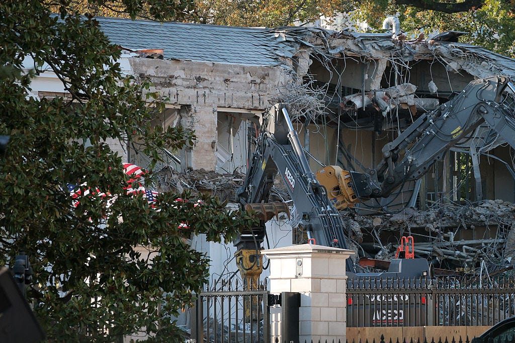 Winging It: The White House has turned the East Wing into a construction site, with an official now confirming the “entirety of the East Wing will be modernized” — i.e., demolished — as part of Trump’s sweeping renovation. In July he said these renovations would not “interfere” with the existing building. As you look at pictures of the East Wing being torn down, you may recall White House Press Secretary Karoline Leavitt similarly assuring reporters that “nothing will be torn down.” Central to the construction is a $300 million ballroom. (That figure was initially $200 million, then $250 million…) Some outlets have reported it will be a whopping 90,000 square feet, nearly twice the size of the White House itself. Trump claims the new ballroom will accommodate almost 1,000 guests, a figure that, like the cost, he has revised upwards multiple times since the plans were first announced. But the numbers don’t add up. The largest ballroom in Washington DC appears to be the Marriott Marquis. At 30,600 feet it accommodates 3,500 people. Trump’s renovation is three times that size for a ballroom meant to accommodate less than one-third the number of people. So what, exactly, will the rest of the space be used for? What is he building?